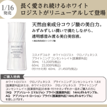 1月16日新発売 コスメデコルテの美白美容液「ホワイトロジスト」が、パワーアップリニューアルします。 シミを根本から抑える美白有効成分「コウジ酸」を、最高濃度配合した美白美容液もラインアップ。 また、集中ケアアイテムとし … 続きを読む