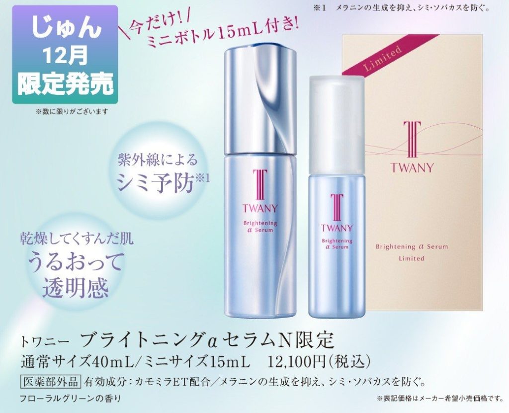 メラニンの生成を抑えてシミ・ソバカスを防ぐブライトニング美容液40mLに、15mLのミニボトルが付いたお得なセットが数量限定で発売になりました。