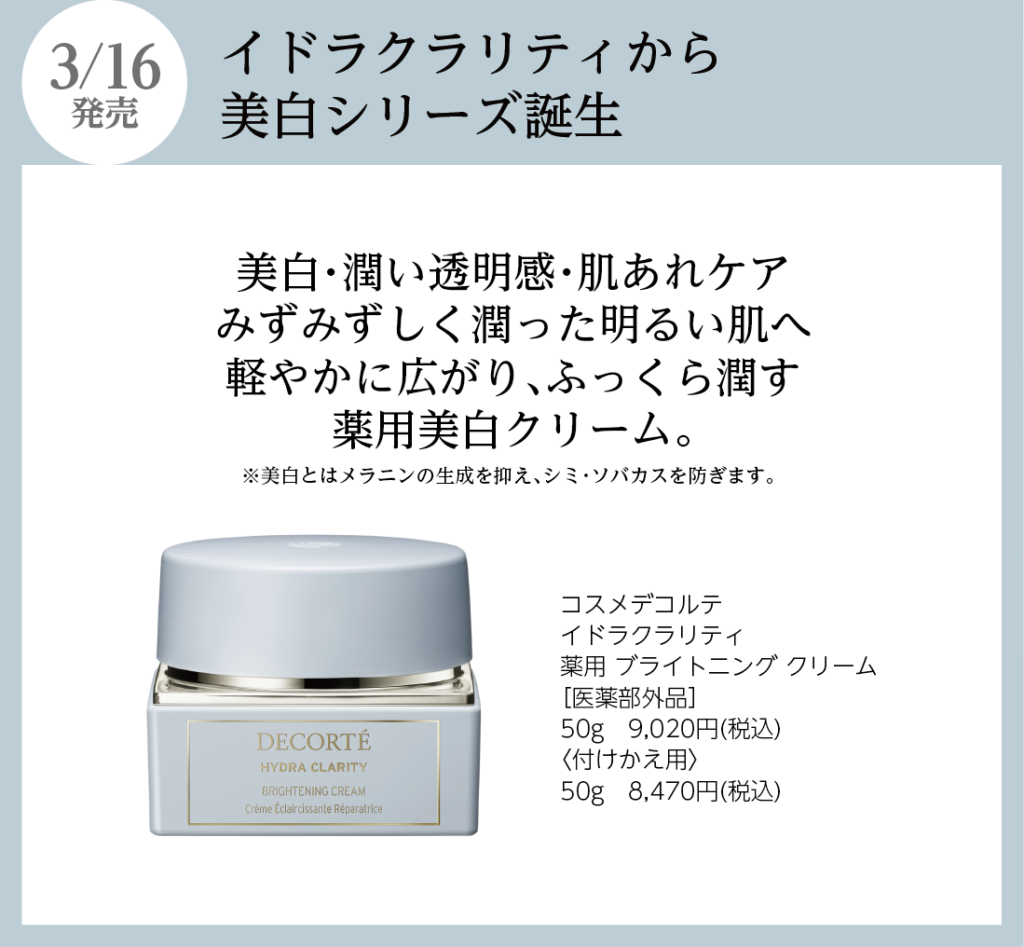 コスメデコルテ イドラクラリティから、美白・潤い透明感・肌あれケアを叶える「薬用美白シリーズ」が登場。