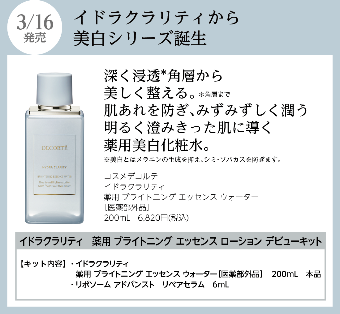 コスメデコルテ イドラクラリティから、美白・潤い透明感・肌あれケアを叶える「薬用美白シリーズ」が登場。