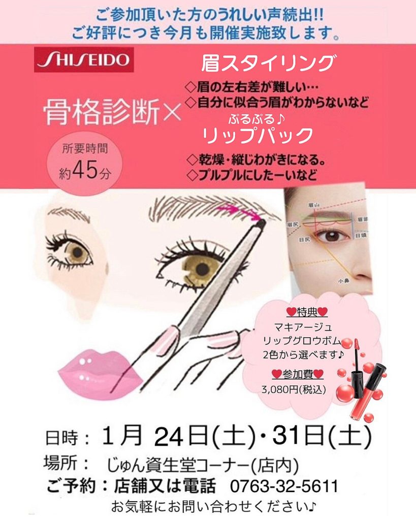 資生堂イベント 1/24・31開催 ❄️資生堂イベント開催のお知らせ❄️ 資生堂 非会員様限定! 大好評の眉スタイリングに加え リップケアまでついたイベントを 下記日程にて開催⛄️🧣 日程:1月24日(土)・31日(土) 2日間限定! 時間:おひとり様45分 参加費:3,080円(税込) 場所:じゅん資生堂コーナー 予約方法:店頭又はお電話 資生堂コーナー直通 ☎️0763-32-5611 特典はマキアージュのリップグロウボムです💞 大人気のイベントになりますので ご予約はお早めに🎶